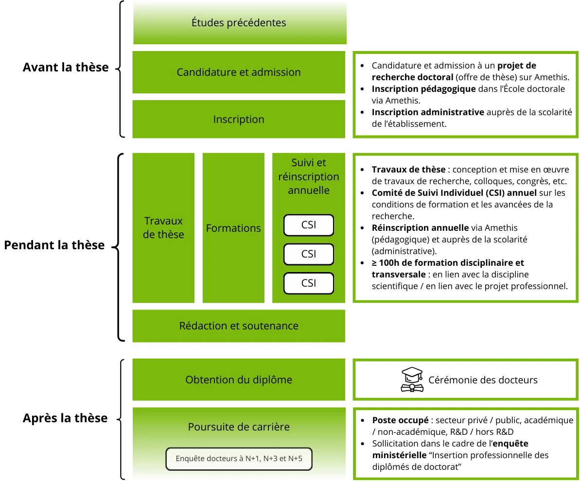 Le doctorat repose sur un projet de recherche original et formateur, qui doit permettre au candidat de devenir un expert international dans sa thématique scientifique.Le doctorat est une expérience professionnelle de recherche, qui permet l'obtention d'un diplôme de niveau BAC+8 reconnu à l’international. Le doctorat s’étend traditionnellement sur 3 années et jusqu’à 6 années maximum, durant lesquelles le doctorant effectue des travaux de recherche sur un sujet en particulier. Le doctorant effectue ses recherches sous la responsabilité d’un Directeur de Thèse (HDR).